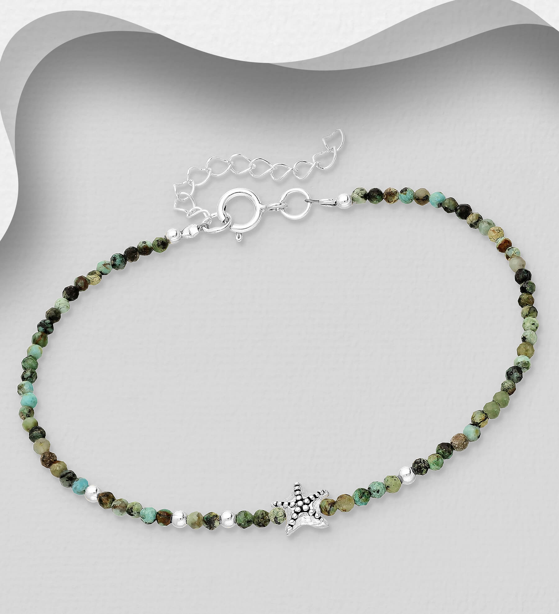 Srebrna narukvica morska zvijezda sa perlicama srebra i afričkog tirkiza