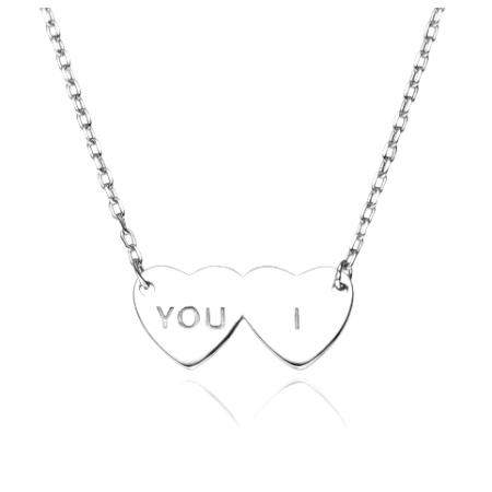 Srebrna ogrlica s dva srca i s natpisima “you”, “I”.