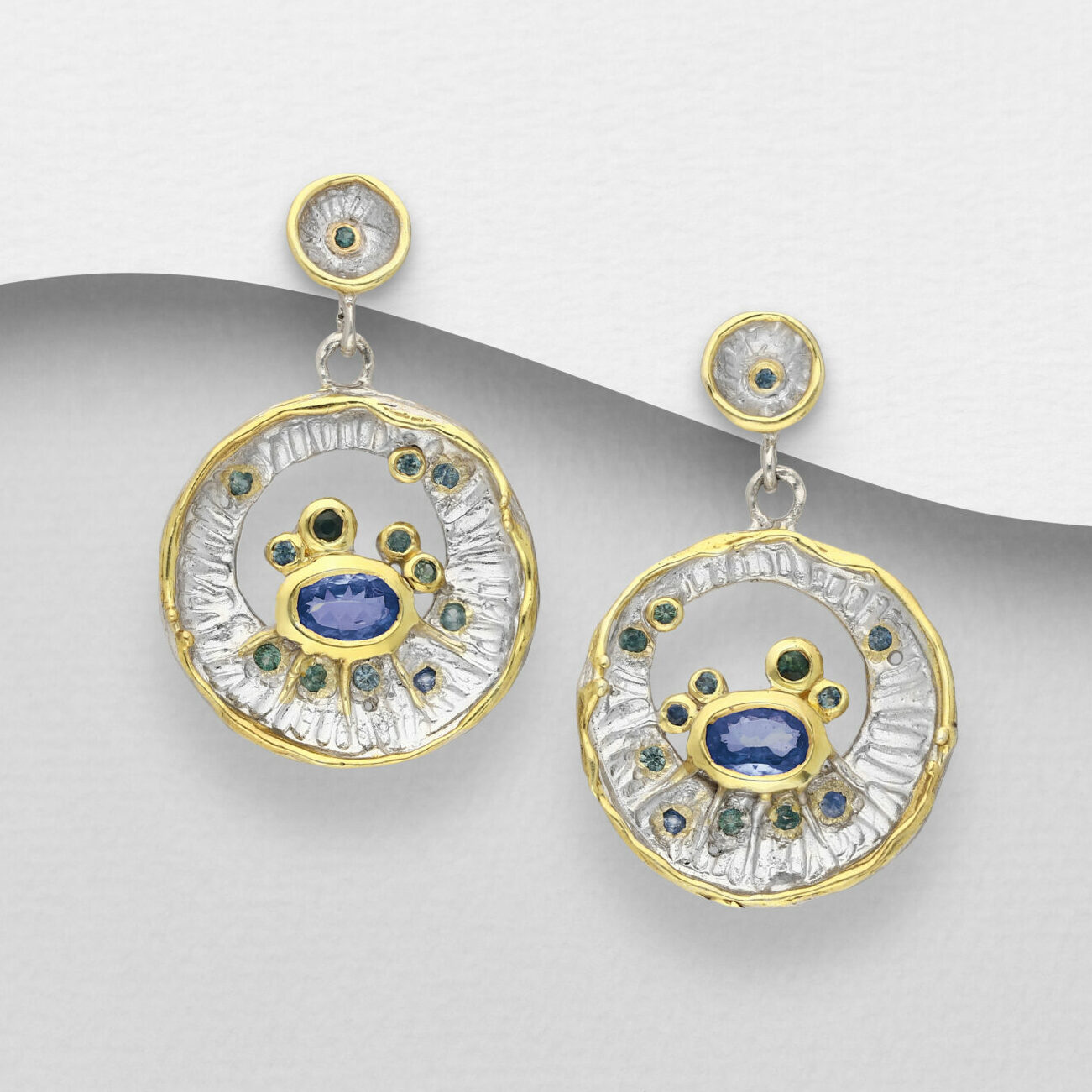 Srebrne naušnice izrađene od srebra 925, presvučene sa bijelim rodijem i 3 mikrona debelim 22 karatnim zlatom. Ukrašene sa tanzanitom i plavim safirima