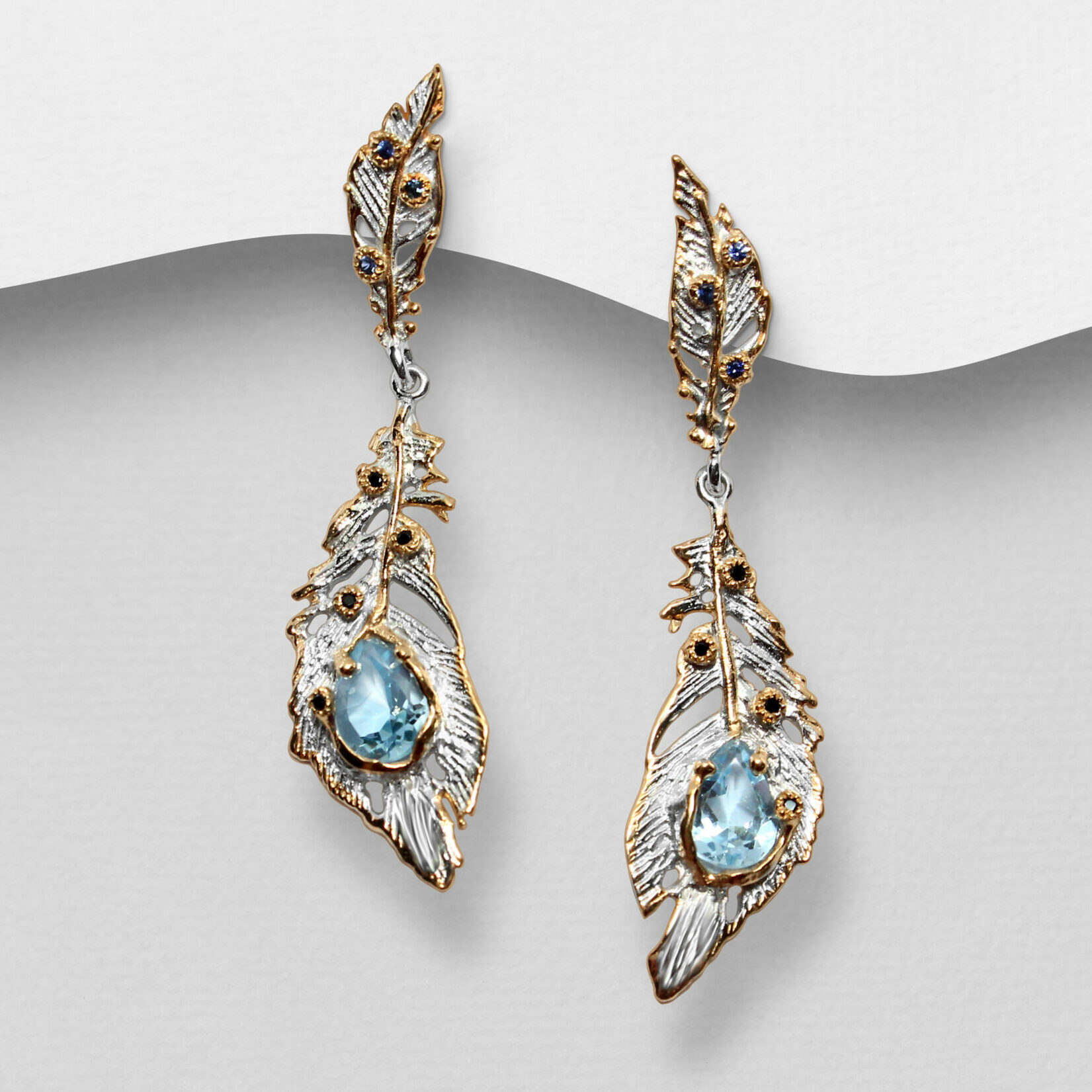 Srebrne naušnice izrađene od srebra 925, presvučene sa bijelim rodijem i 3 mikrona debelim 22 karatnim rozim zlatom. Ukrašene sa plavim topazom i plavim safirom