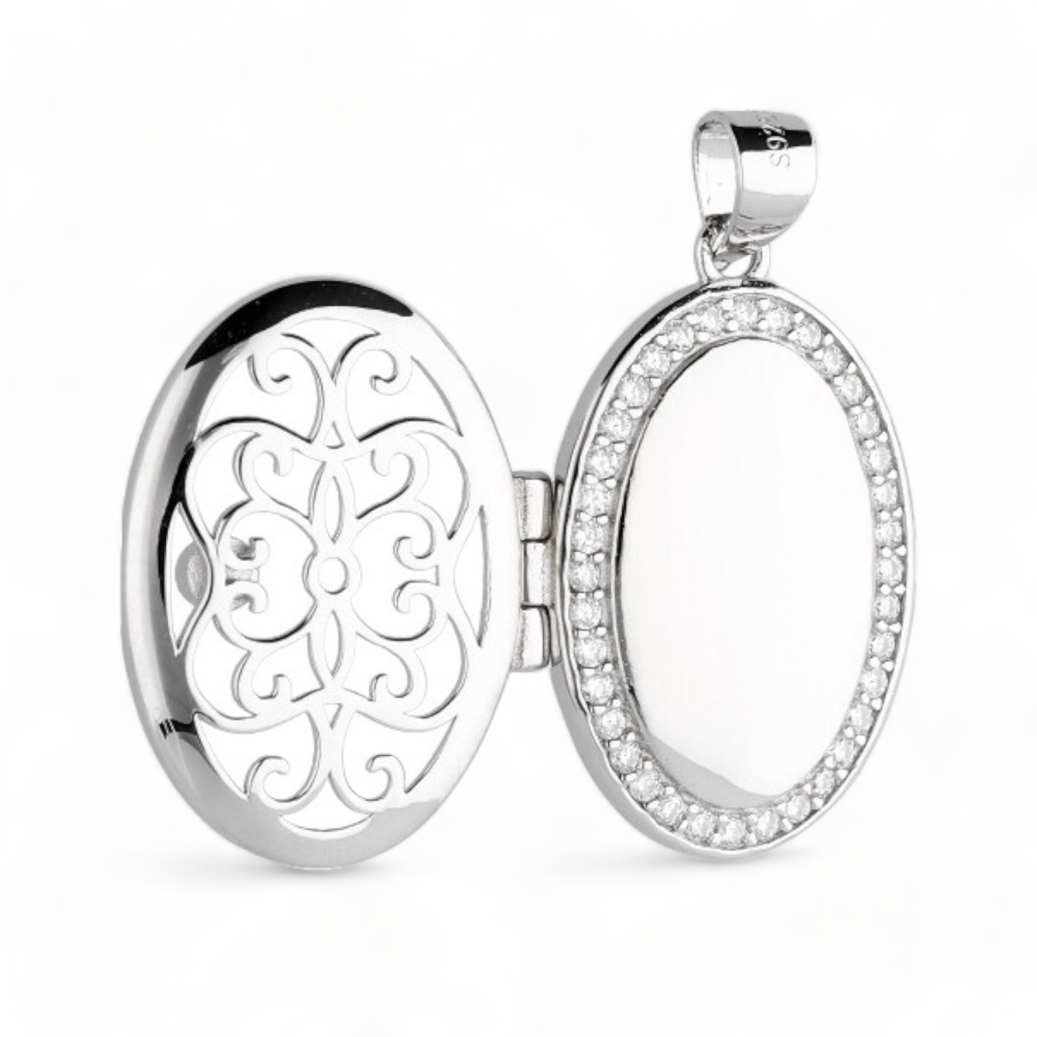 Privjesak je presvučen tankim slojem rodija (rodinirana) radi zaštite od tamnjenja i ljepšeg sjaja i ukrašen je cirkonima.