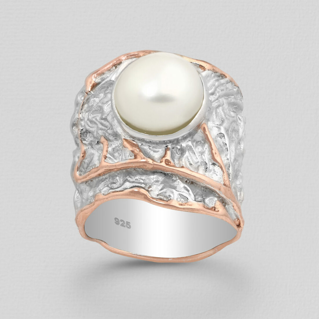 Srebrni prsten izrađen od srebra 925, presvučen sa bijelim rodijem i 3 mikrona debelim 22 karatnim rozim zlatom. Ukrašen sa slatkovodnim biserom