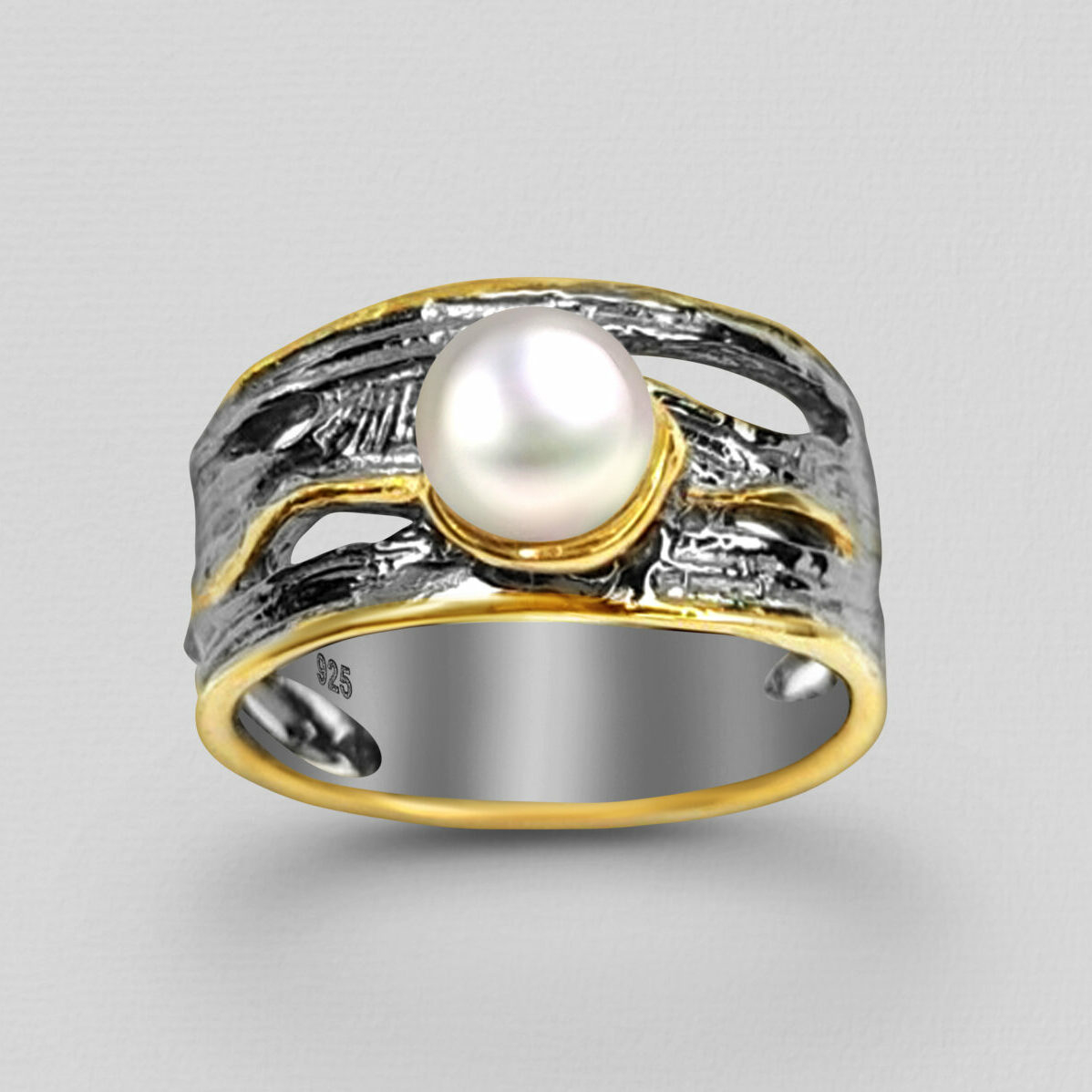 Srebrni prsten izrađen od srebra 925, presvučen sa crnim rodijem i 3 mikrona debelim 22 karatnim zlatom. Ukrašen sa  slatkovodnim biserom