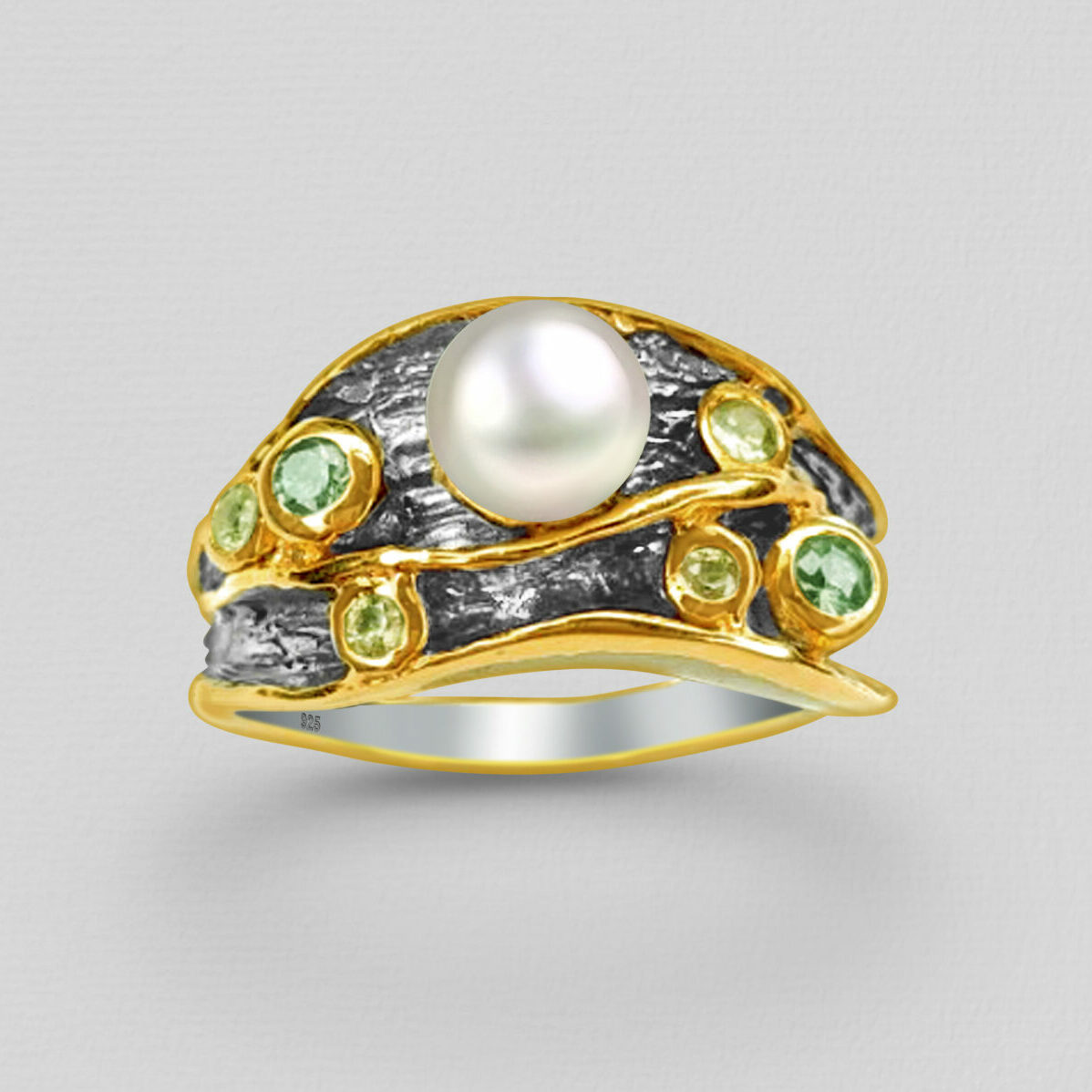 Srebrni prsten izrađen od srebra 925, presvučen sa bijelim rodijem i 3 mikrona debelim 22 karatnim zlatom. Ukrašen sa slatkovodnim biserom i zelenim safirima