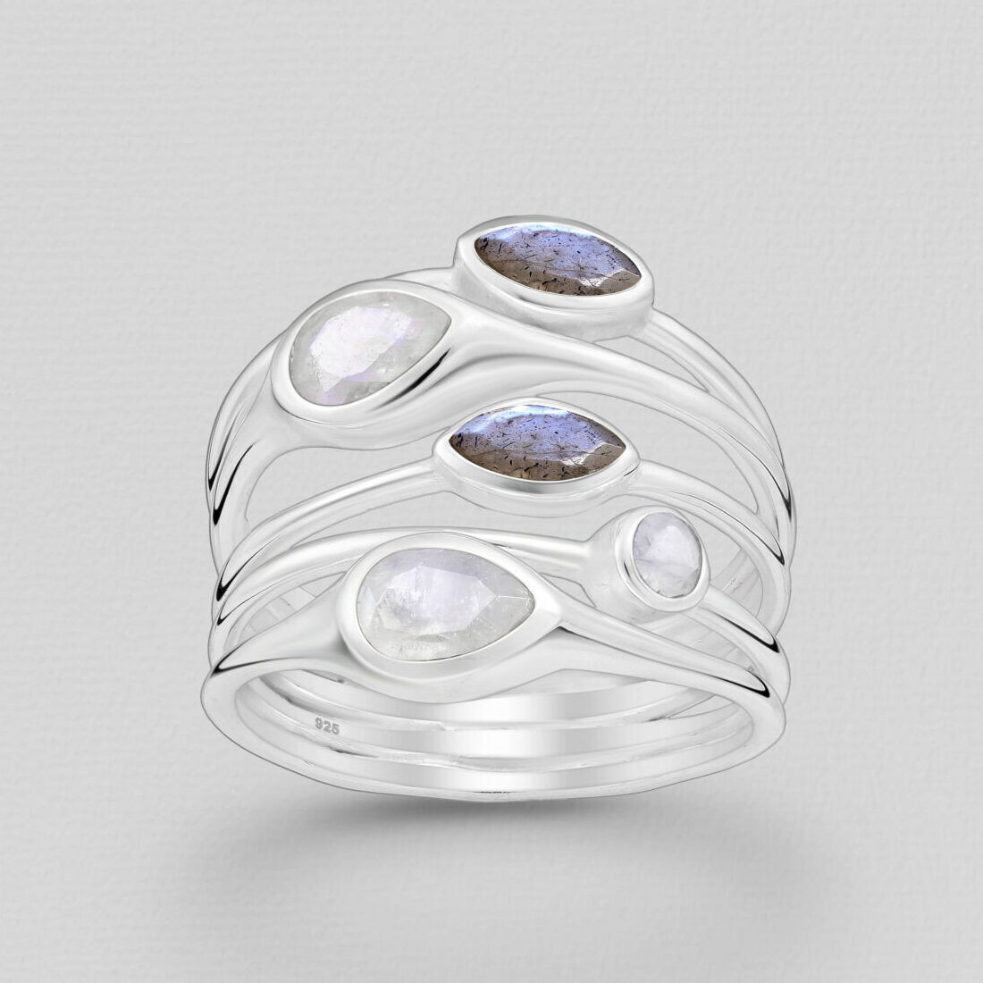 Srebrni prsten izrađen od srebra 925, ukrašen sa labradoritom i mjesečevim kamenom