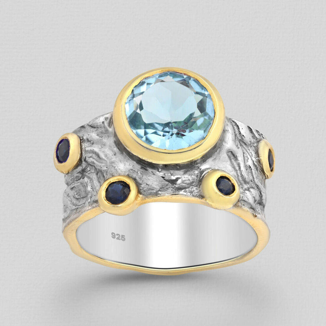 Srebrni prsten izrađen od srebra 925, presvučen sa sivim rutenijem i 3 mikrona debelim 22 karatnim zlatom. Ukrašen sa plavim topazom i plavim safirima